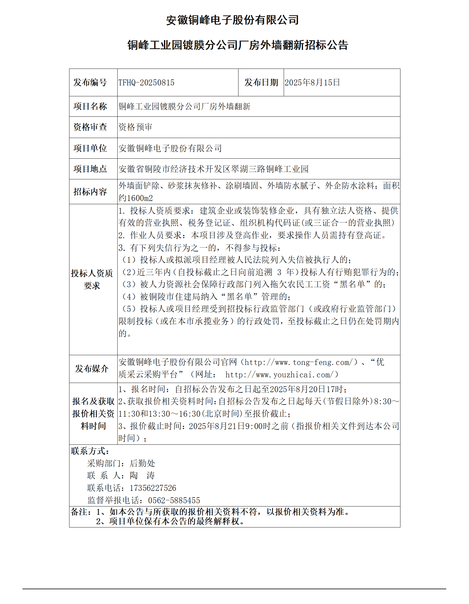 安徽銅峰電子股份有限公司 (鍍膜分公司廠房外墻翻新招標(biāo)公告)_01